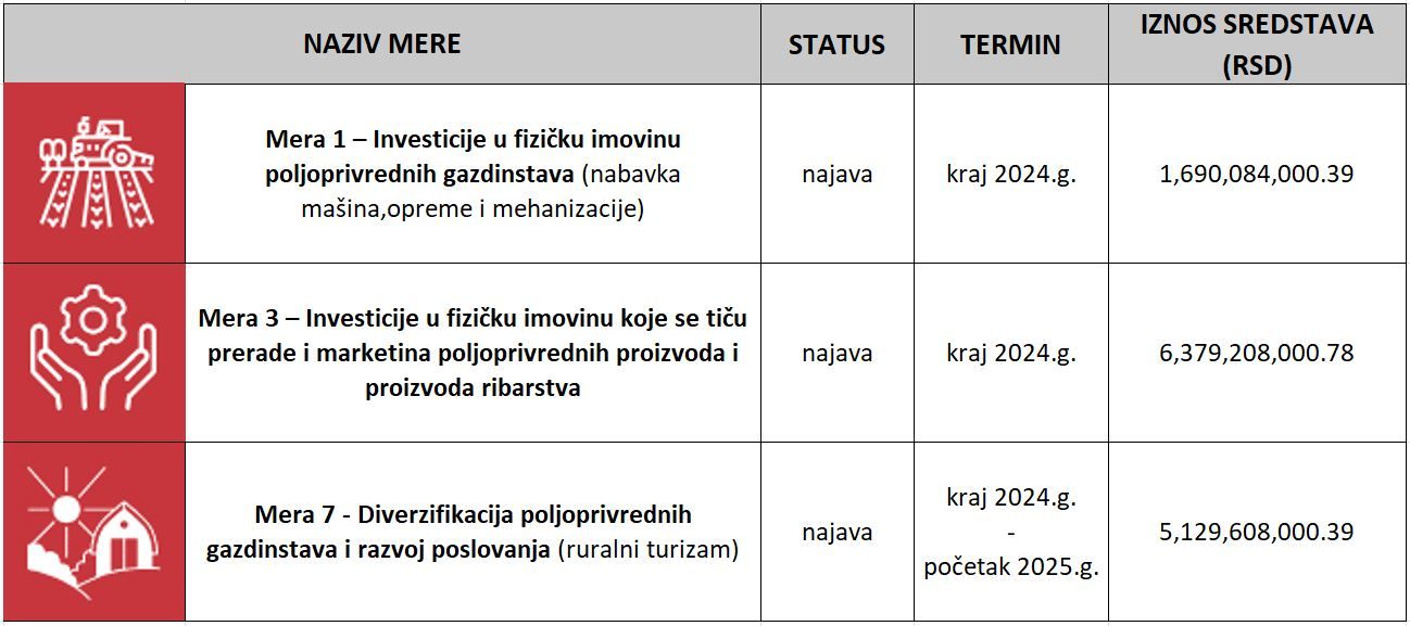 Do kraja 2024. godine je planirano raspisivanje još 2  poziva i to za Meru 3 – Investicije u fizičku imovinu koje se tiču prerade i marketinga poljoprivrednih proizvoda i proizvoda ribarstva sa ukupno predviđenim  budžetom od  6,379,208,000.78 dinara i poziv za Meru 1 - Investicije u fizičku imovinu poljoprivrednih gazdinstava (nabavka mašina,opreme i mehanizacije) sa ukupno predviđenim  budžetom od 1,690,084,000.39 dinara.